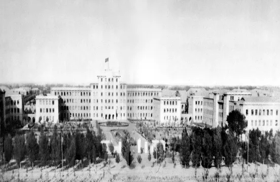 1952年4月22日上午,重工业部钢铁工业局抽调陈琅环、柏华、丘玉池、李瑞震震等19位同志举行了筹建北京钢铁工业学院第一次筹备工作会议。欣闻新中国钢铁学府的诞生,胸怀钢铁强国的梦想,魏景昌、魏寿昆、张文奇、胡庶华、章守华、赵锡霖等大批名师巨擘从天津、唐山、西安、太原乃至世界各地汇聚而来,从此,一所承载着新中国“钢铁强国”梦想的最高学府在这片古老的“满井村”安营落户。就是在这样的情况下,正是一口“满井”(在今学校南门附近)的井水供养着全校几千人的生活,更是建筑施工用水的全部来源。初创时期的校园建设以莫斯科钢铁学院为蓝本,主配楼虽然没有苏联建筑标志性的木制大尖顶和红五星,但仍是典型的苏式建筑风格,方正而简约。